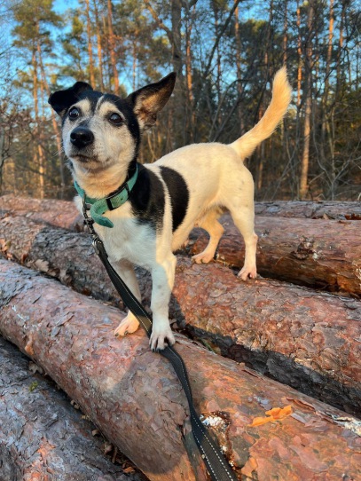 Draußen bewegt er sich gern und erkundet aufmerksam seine Umgebung. Sein Jagdtrieb ist im Alltag überraschend gering ausgeprägt: Im Wald bleibt er auf den Wegen, Kaninchen oder Vögel interessieren ihn kaum. Nur Mäuse- oder Rattennester ziehen ihn sehr in den Bann, da zeigt er typischen Terrier-Eifer. Spaziergänger, Radfahrer oder Jogger ignoriert er souverän, bei Hundebegegnungen reagiert er jedoch fixierend, weshalb ein sicherer, ruhiger Mensch an seiner Seite wichtig ist.